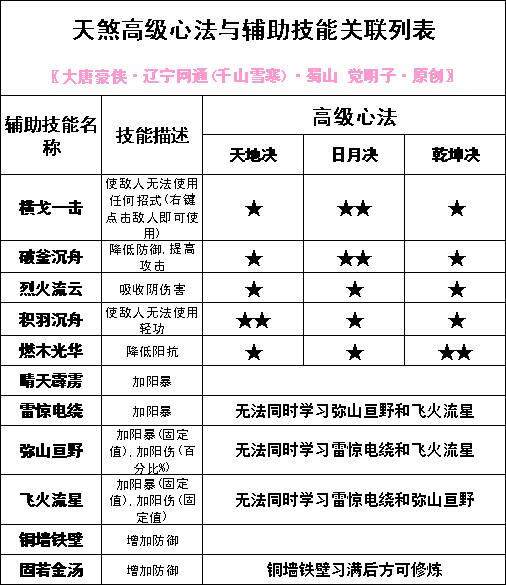 OK,天煞的3个高级心法分别是:天地决、日月决、乾坤决。从上表我们可以看出,这3个高级心法分别对4个辅助技能起到了决定性的作用。下面我来分析一下,并将高级心法与辅助技能的关联给出: